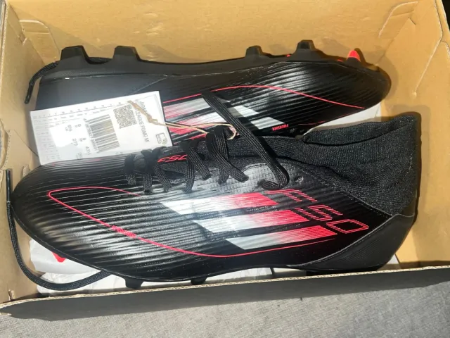 Botas de fútbol Adidas negras con detalles en rojo y blanco. - Talla 43 (EU) / 9 (UK) / 275 (CM). - Diseño Fiberskin. - Suela FG/MG.