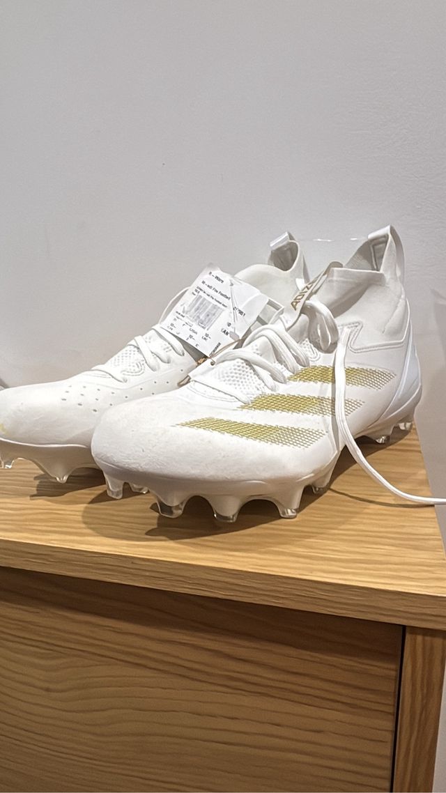 Detalles del productoBotas de fútbol americano Adidas talla 45 en color blanco con detalles dorados. Diseñadas para el máximo rendimiento en el campo.