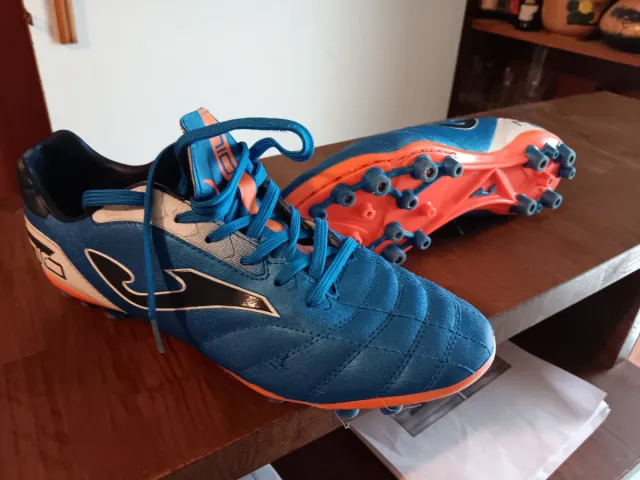 Detalles del productoBotas de fútbol Joma en color azul con detalles naranjas y suela con tacos.