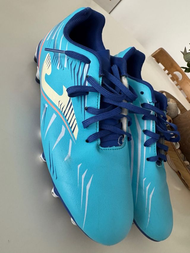 Botas de fútbol de color azul con un diseño llamativo. - Diseño con líneas blancas y detalles en naranja. - Cordones azules. - Suela con tacos. - Talla 39