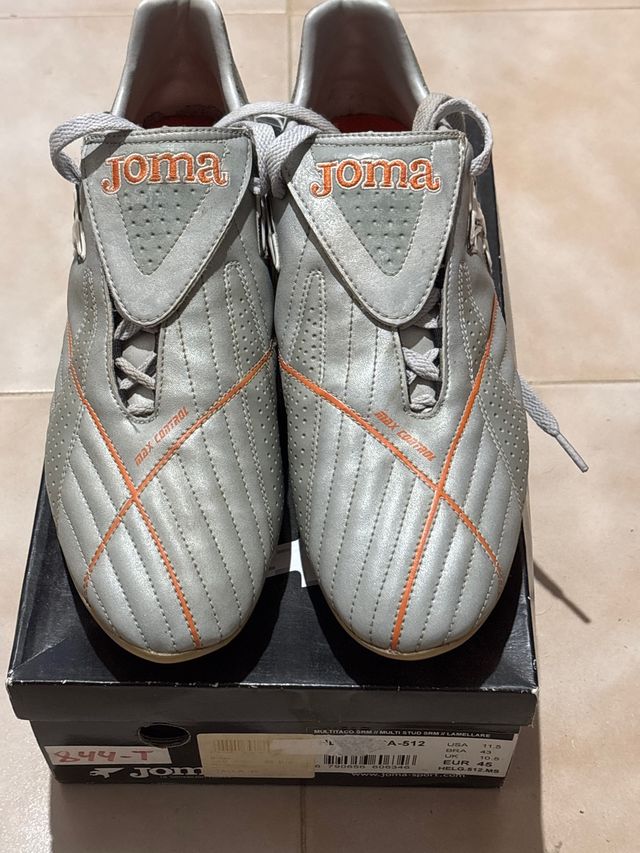 Botas de fútbol Joma multitaco en color plateado con detalles en naranja. - Modelo: A-512 - Talla EUR: 45 - Talla USA: 11.5 - Talla BRA: 43 - Talla UK: 10.5