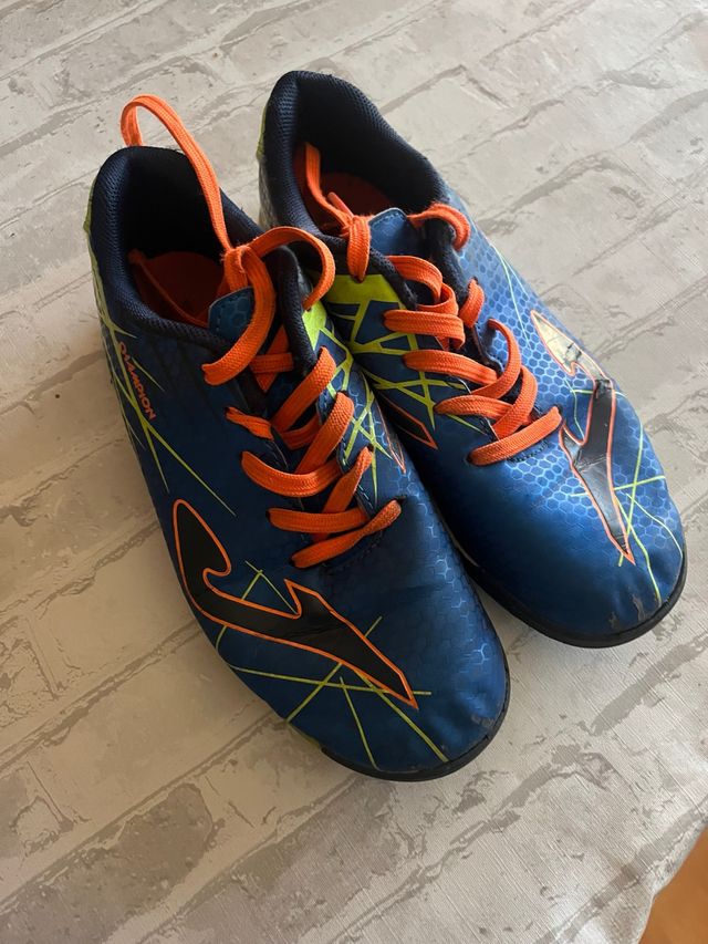 Botas de fútbol para niño de la marca Joma. - Color azul con detalles en naranja y amarillo. - Cierre con cordones. - Diseño deportivo.
