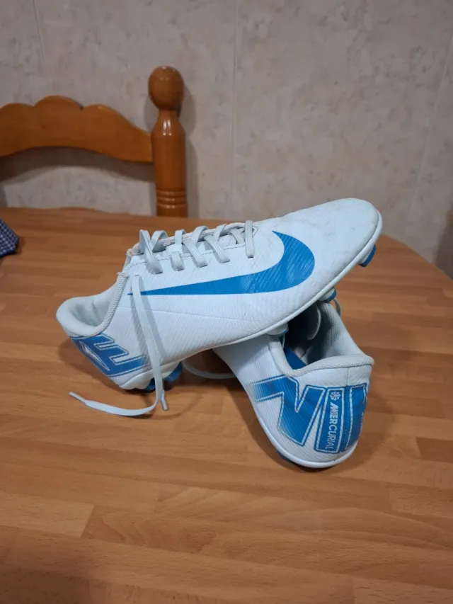 Detalles del productoBotas de fútbol Nike Mercurial en color blanco con detalles en azul.