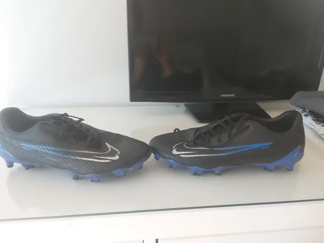 Detalles del productoBotas de fútbol Nike en color negro con detalles en azul y plateado, diseñadas para césped artificial.