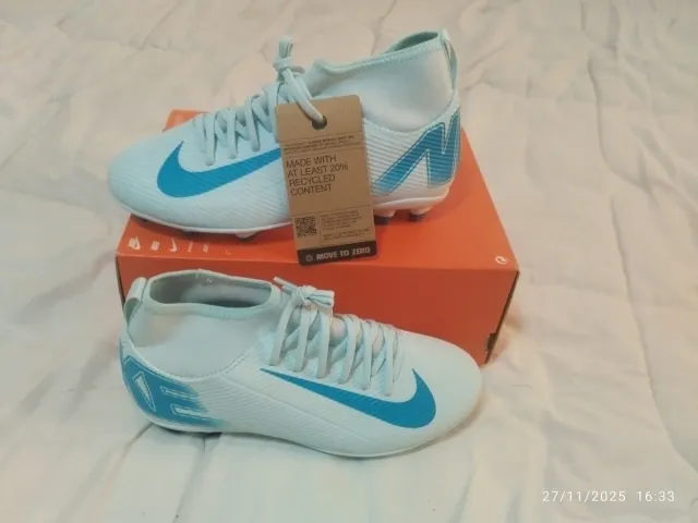 Botas de fútbol Nike para niños en color blanco y azul. - Diseño moderno. - Cierre con cordones. - Logo de Nike en el lateral. - Detalle de M en el talón.