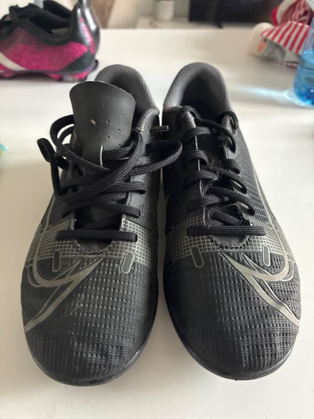 Botas de fútbol Nike para niños, ideales para la práctica deportiva. - Color negro con detalles plateados. - Cierre con cordones.