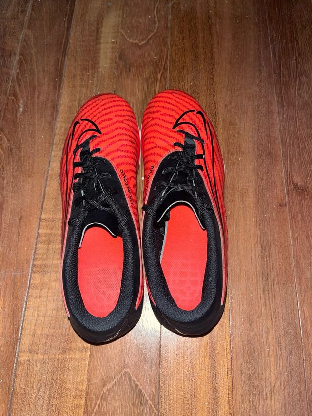 Botas de fútbol Nike Phantom en color rojo y negro. - Diseño con patrón de líneas. - Cordones negros. - Logo de Nike.