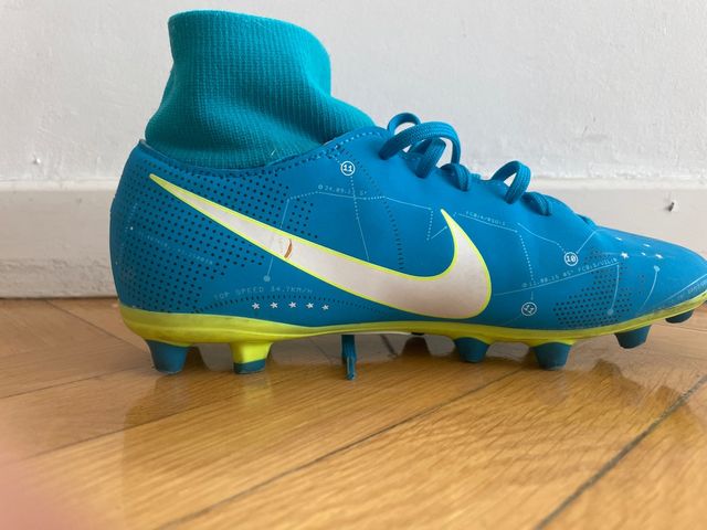 Detalles del productoBotas de fútbol Nike en color azul con detalles en amarillo y blanco. Diseñadas para ofrecer un buen rendimiento en el campo.