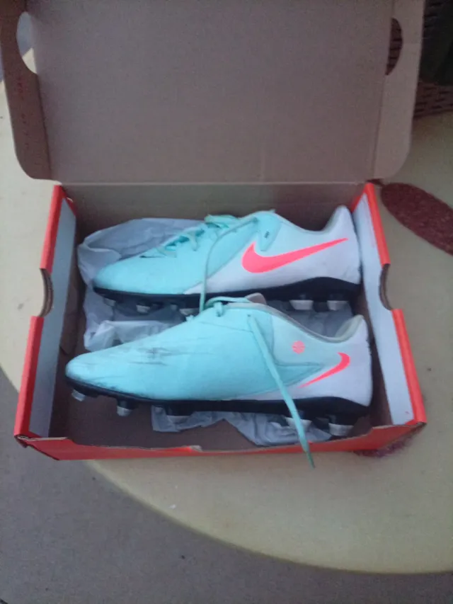 Detalles del productoBotas de fútbol Nike en color azul claro y blanco, con detalles en coral. Se venden porque se han quedado pequeñas.