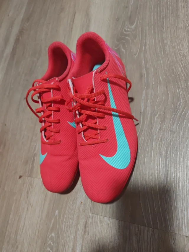 Botas de fútbol Nike en color rojo y detalles en turquesa. Talla 42. - Cierre con cordones. - Diseño deportivo.
