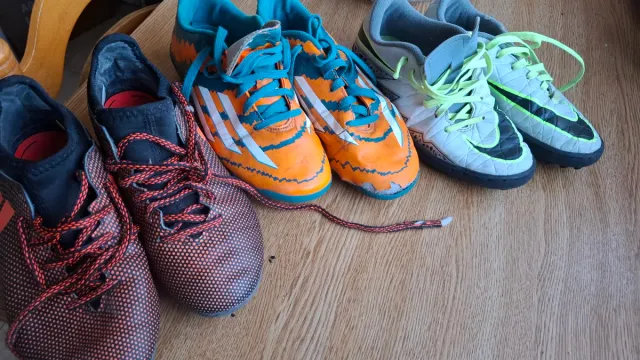 Lote de botas de fútbol para niño en varias tallas. - Talla 32 Nike blancas - Talla 33 adidas negro - Talla 34 adidas naranja