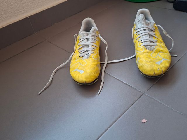 Botas de fútbol Puma de color amarillo. Perfectas para jugar en césped. - Diseño llamativo en amarillo. - Cordones grises. - Marca Puma.