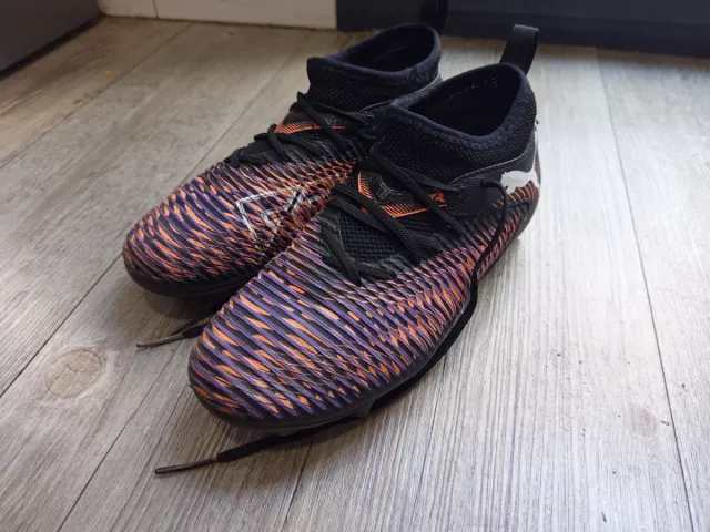 Botas de fútbol para niño con un diseño llamativo. - Combinación de colores naranja y morado. - Cierre con cordones. - Diseño tipo calcetín para un ajuste cómodo.