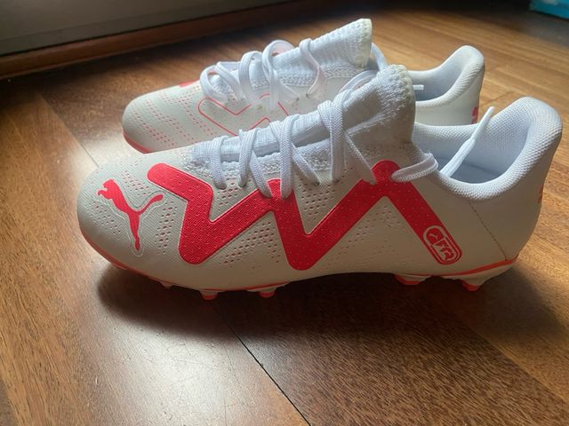 Botas de fútbol Puma en color blanco con detalles en coral. - Talla 35. - Diseño moderno y llamativo. - Marca Puma.