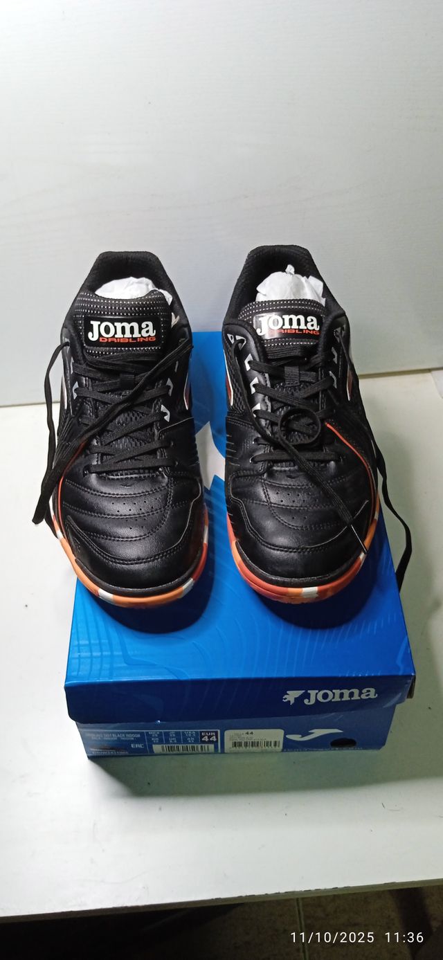 Detalles del productoBotas de fútbol sala Joma en color negro con detalles en naranja y blanco. Perfectas para jugar en pistas. Solo se han usado una vez, caja original con ticket de compra.
