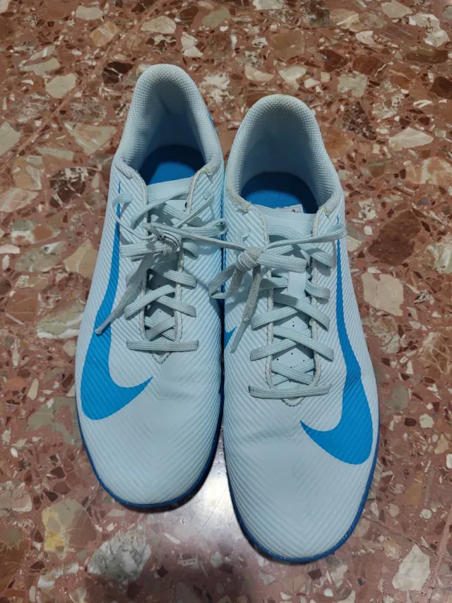 Botas de fútbol sala Nike en color azul y blanco. - Diseño con franjas. - Swoosh de Nike en contraste.