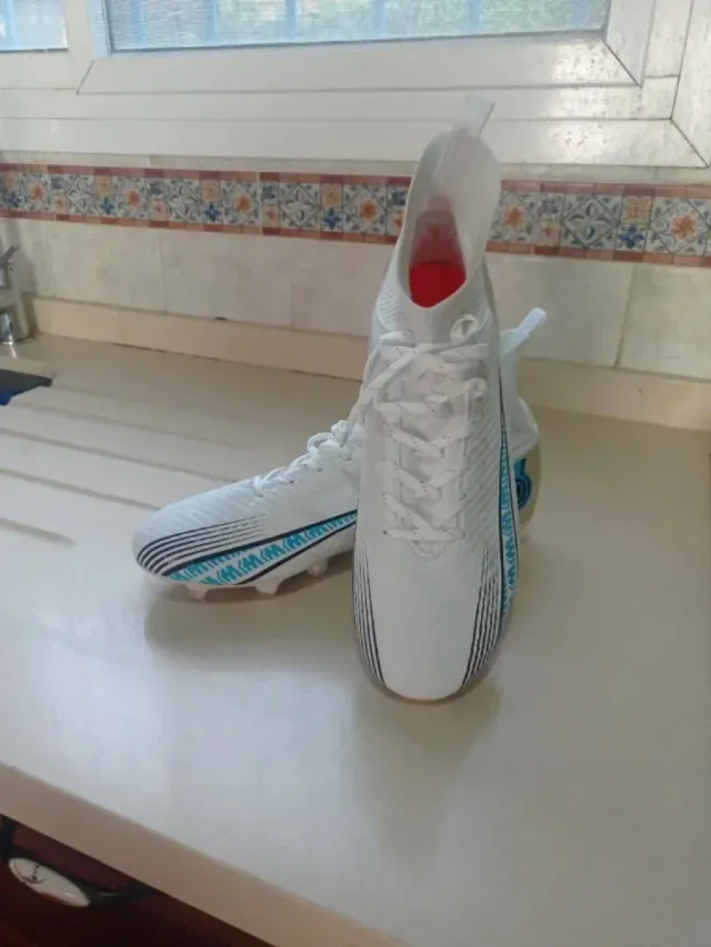 Detalles del productoBotas de fútbol de color blanco con detalles en azul.