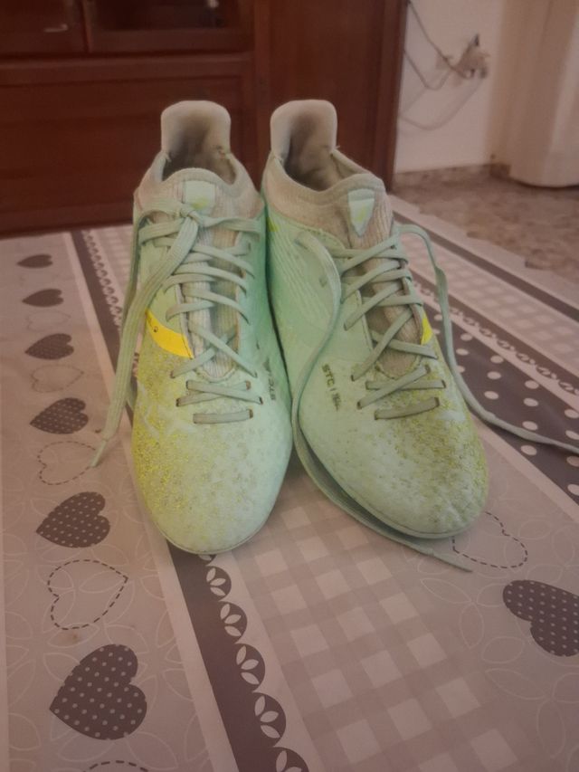 Detalles del productoBotas de fútbol de color verde menta con detalles en amarillo. Diseñadas para ofrecer comodidad y rendimiento en el campo.