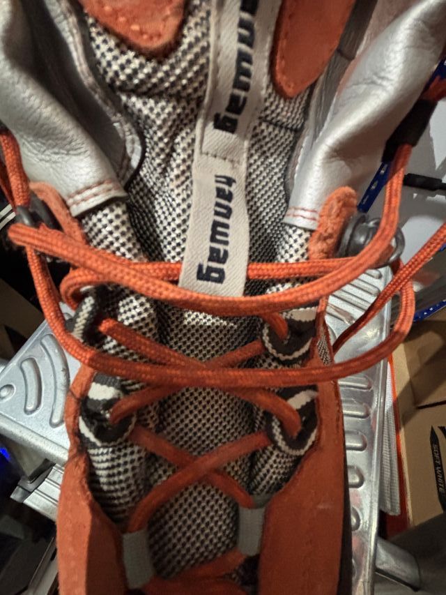 Botas de montaña Hanwag con cordones naranjas. Talla 45 - Parte superior de cuero plateado y naranja. - Suela con patrón de rejilla. - Cordones naranjas.