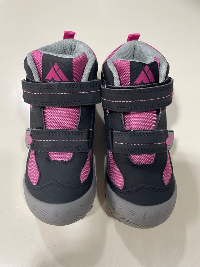Botas de montaña nuevas, talla28. - Color negro y rosa. - Cierre de velcro. - Suela de goma antideslizante.