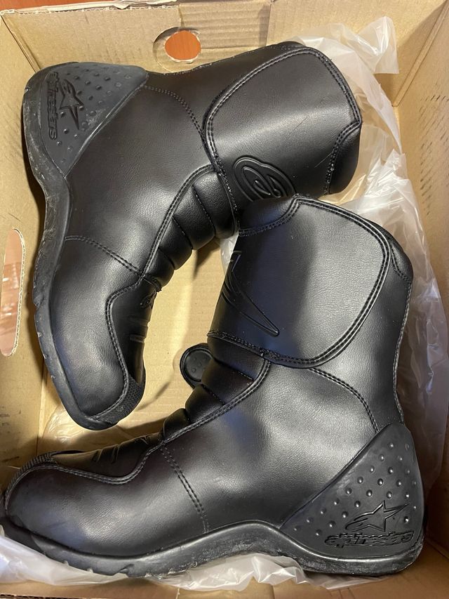 Botas de moto de la marca Alpinestars en color negro. - Diseño de caña alta. - Protecciones en talón y tobillo. - Cierre con velcro y cremallera.