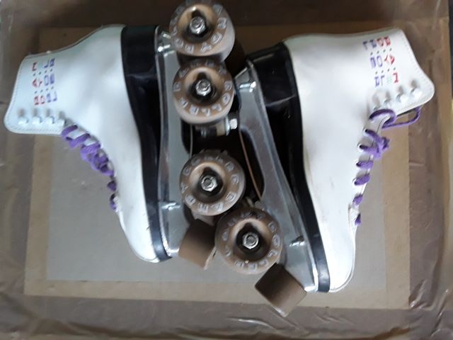 Botas de patinar de color blanco con cordones morados. - Diseño clásico. - Ruedas de color marrón.