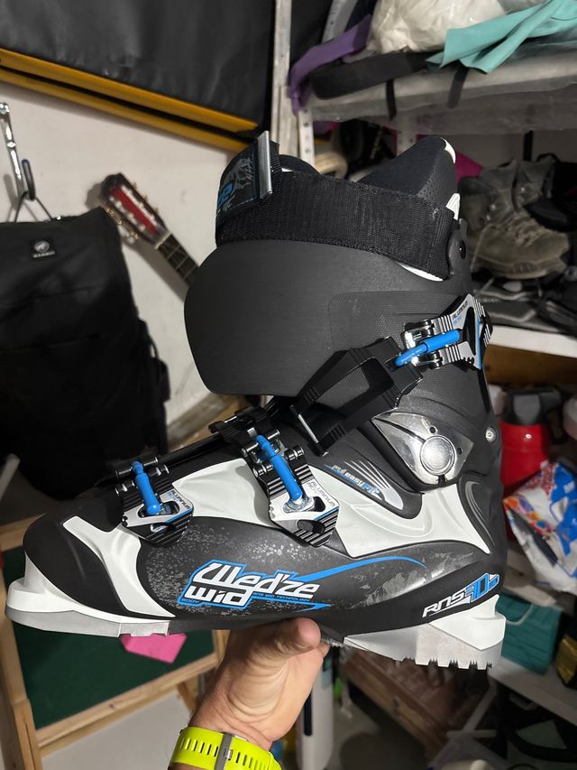 Botas de esquí de la marca Lange, modelo Wid. - Cierre con hebillas de aluminio. - Diseño en color negro, blanco y azul. - Tecnología RNS.