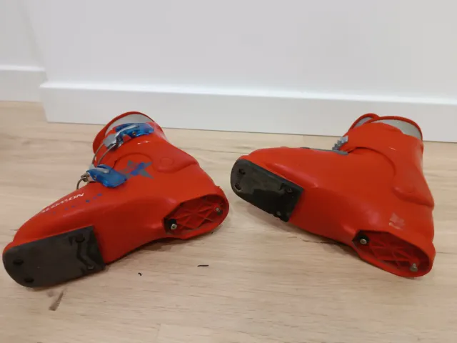 Botas de esquí Salomon en color rojo, talla 20 (equivalente a un pie de talla 32). Faltan las taloneras.