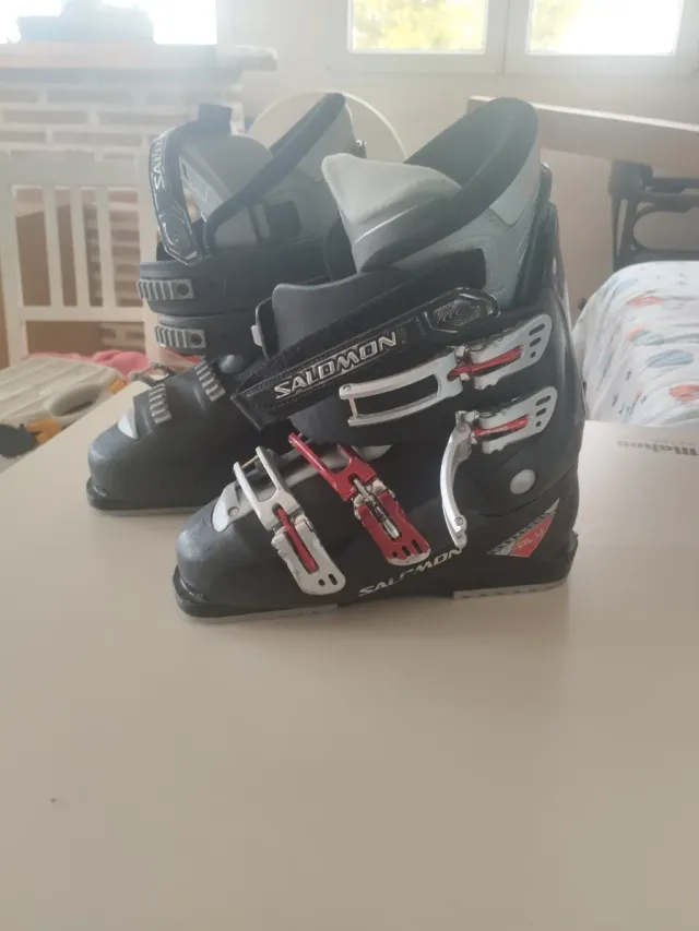 Botas de esquí Salomon en talla 26 - 26.5. - Cierre con hebillas. - Diseño deportivo.