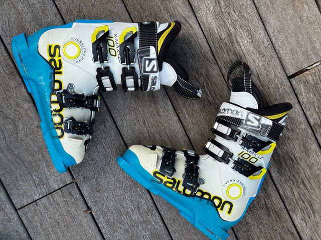 Detalles del productoBotas de esquí Salomon X-Max LC 100 en color blanco, azul y amarillo. Utilizadas solo dos temporadas.