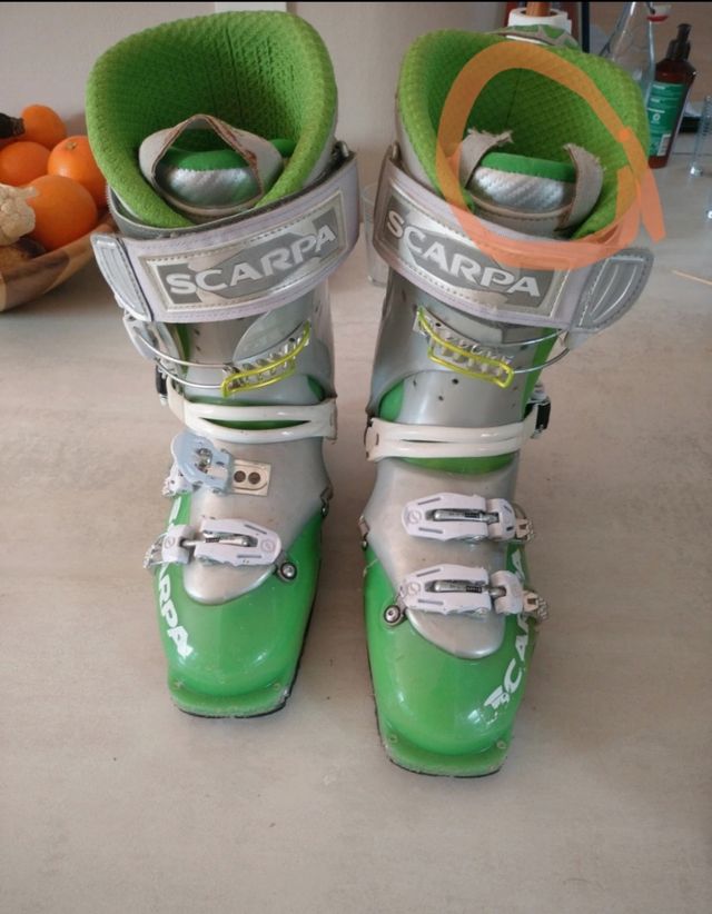 Detalles del productoVendo estas maravillosas botas de esquí de travesía o montaña. Scarpa Gea talla 25.5 que equivale a 39,5-40. Botas cómodas y polivalentes, suelas Vibram. En muy buen estado, muy poco uso. Presentan algo de suciedad y ligeros arañazos superficiales. En la primera foto se aprecia una rotura en el tirador superior de la bota izquierda. Quitando ese detalle están perfectas. Precio nuevas 350 euros, Ofertón por solo 70 euros envío incluido en el precio!!! 👌
