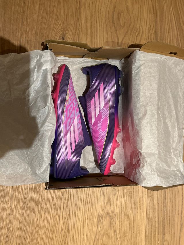Botas de fútbol Adidas F50, modelo sin estrenar. - Diseño en morado y rosa. - Talla 44