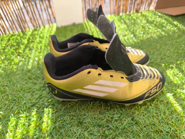 Botas de fútbol Adidas F50 Messi para niño número 33 - Color dorado y negro. - Diseño F50 Messi. No tiene los cordones.