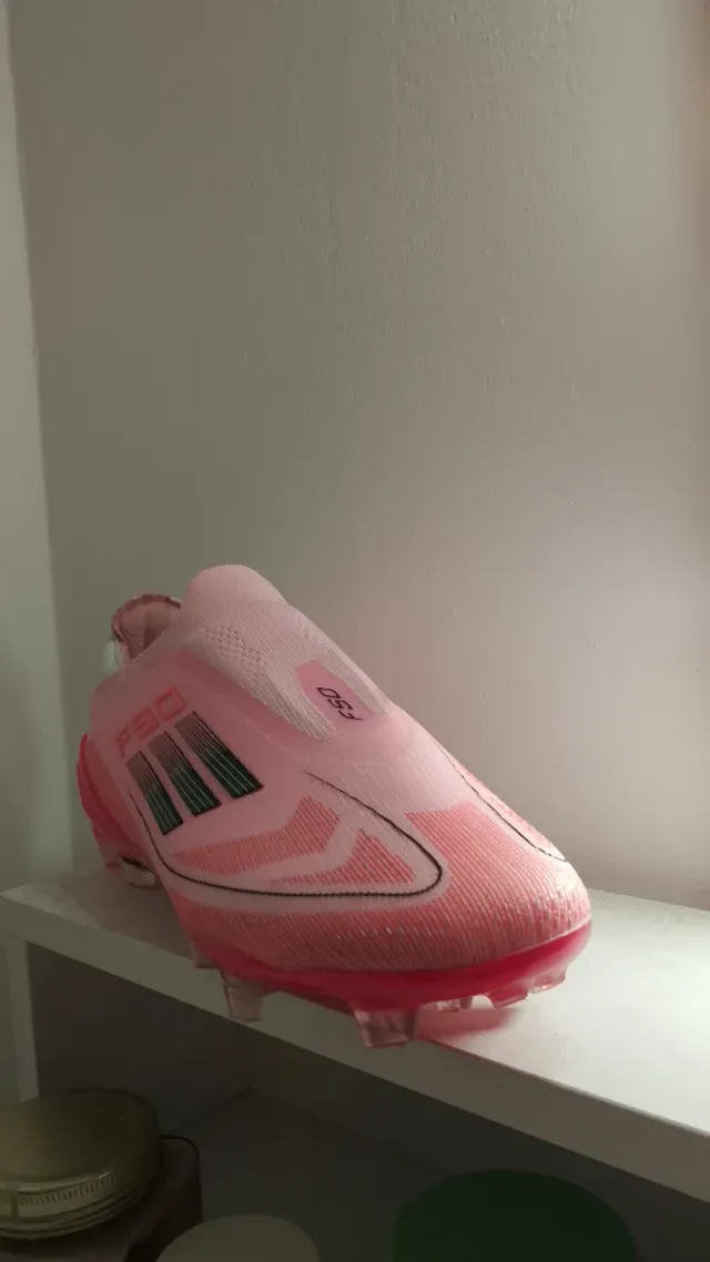 Botas de fútbol Adidas F50 en color rosa. - Talla 39/40. - Diseño sin cordones. - Suela para césped artificial o natural.