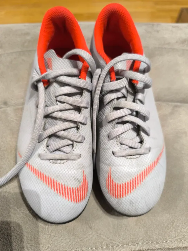 Detalles del productoBotas de fútbol Nike Mercurial en color gris con detalles en naranja.
