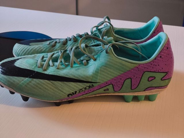 Detalles del productoBotas de fútbol Nike ZOOM MERCURIAL Gama media con un diseño llamativo en tonos menta y morado (Talla 45) equivale a 43'5-44 Europeo