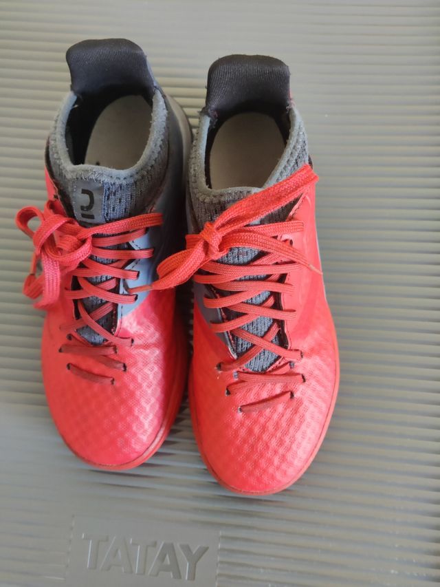 Botas de fútbol para niño, en color rojo y gris. Ideales para jugar en hierba artificial - Son dos botas. - Están en buen estado. - Talla 33 de niño.