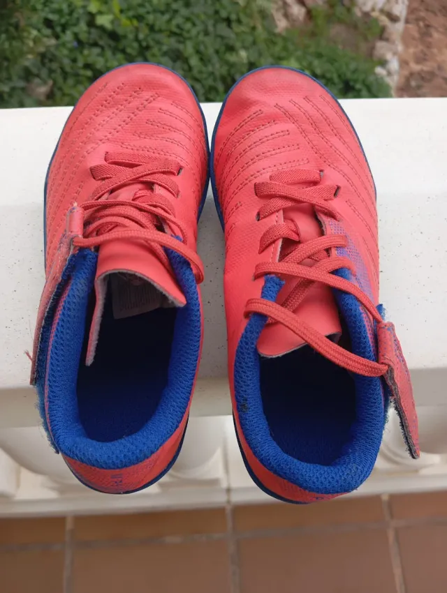 Botas de fútbol para niño en talla 28. Color rojo con detalles en azul. - Cierre con cordones y velcro. - Suela para césped artificial o interior.