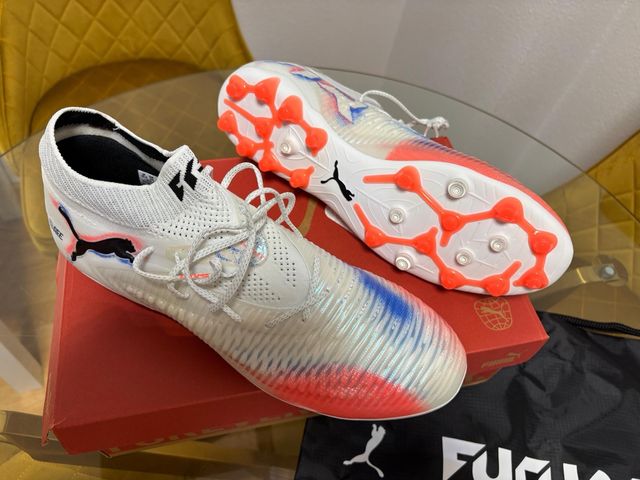 Detalles del productoBotas de fútbol Puma Future en color blanco con detalles en rojo y azul. Diseñadas para un rendimiento óptimo en el campo.
