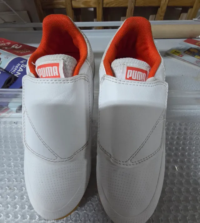 Botas de fútbol sala para niño de la marca Puma. - Talla 31. - Color blanco con detalles naranjas. - Cierre de velcro.