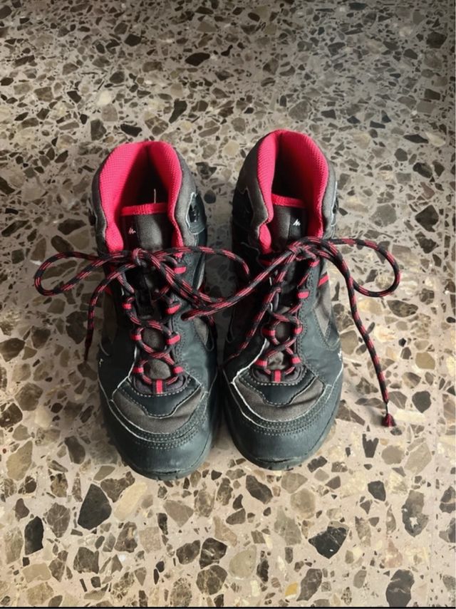 Botas de montaña, usadas pero en perfecto estado, son grises, negras y rosas por dentro. Tiene cordones para ajustarla al pie.