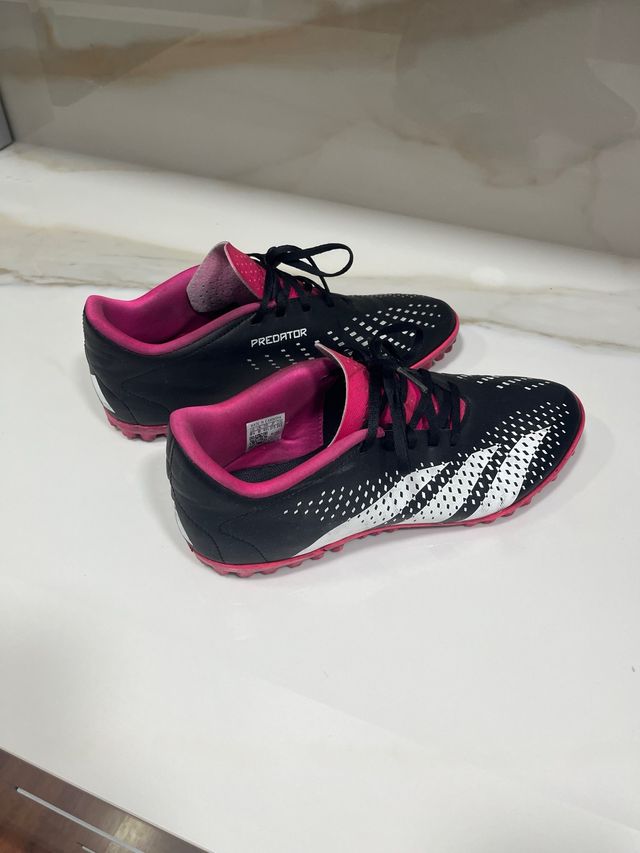 Botas de fútbol Adidas Predator en color negro y detalles en rosa. - Talla 43. - Diseño multitaco. - Cierre con cordones.