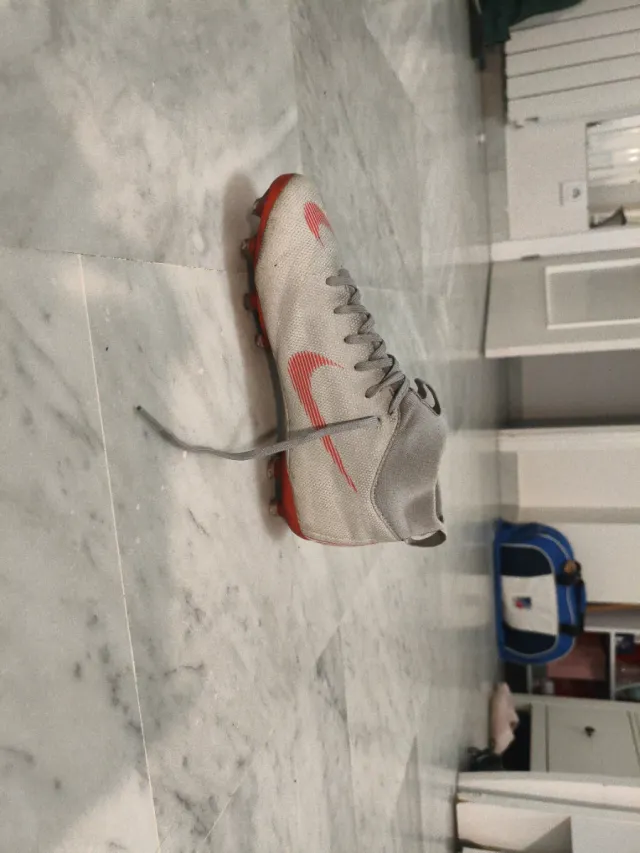 Botas de fútbol Nike Mercurial en color gris y detalles en rojo. Talla 37. - Diseño de media caña. - Cierre con cordones. - Suela con tacos para césped.