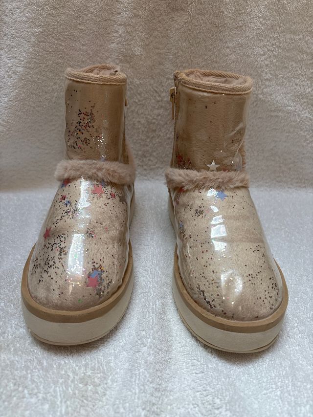 Detalles del productoBotas de agua para niña de color beige con estrellas y purpurina, diseño impermeable e interior con forro suave y cálido. Talla 33 con medida exterior de la suela 23 cm e interior 21cm