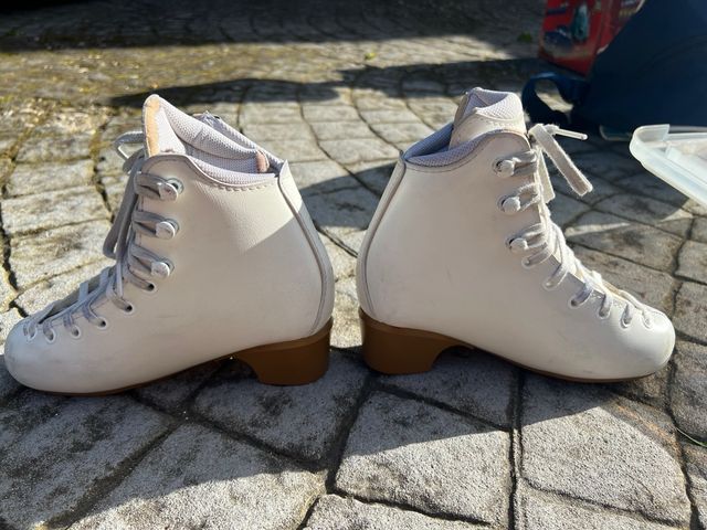 Patines artísticos en muy buen estado. Ideales para principiantes. - Color blanco. - Talla patines 215s - Material: Piel sintética.