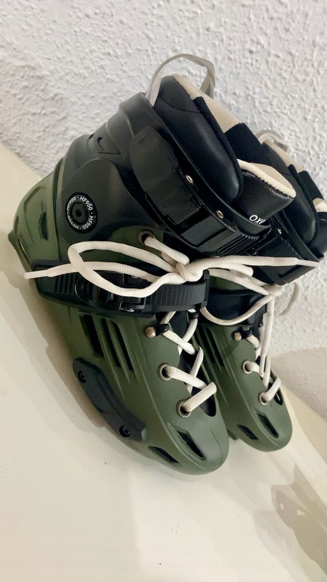 botas de patines en línea en color verde y negro. - Talla 35-36. - Cierre con cordones blancos y hebilla. - Diseño ventilado.