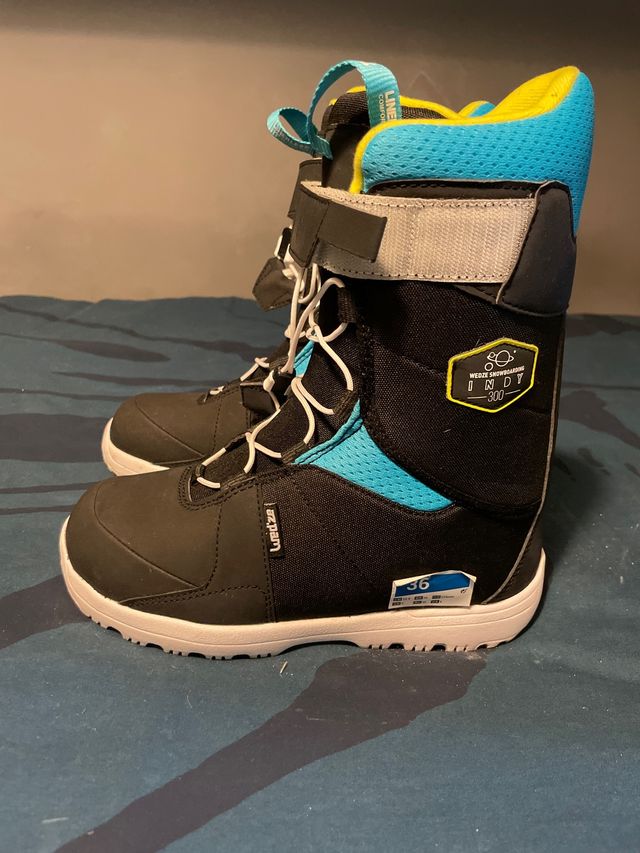 Botas de snowboard Wed'ze Indy 300 para niño.❗️Precio negociable ❗️ - Color negro, azul y amarillo. - Cierre con cordones y velcro. - Talla 36.