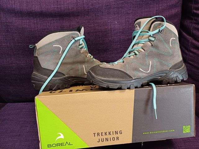 Detalles del productoBotas de trekking y senderismo niña BOREAL Aspen Girl, talla 37, en perfecto estado, muy poco usadas, cómodas y resistentes, tejido hidrofugado, plantilla Boreal, membrana impermeable y transpirable, suela vibram.