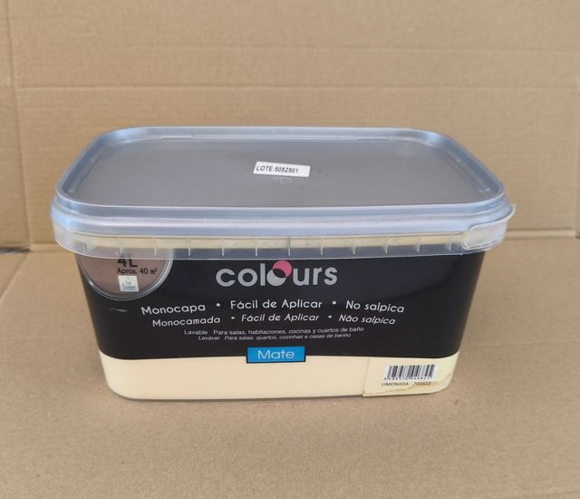 Se vende bote de pintura Colours amarillo limonada 705922. Es de Leroy Merlín. Bote de 4 litros, para 40m cuadrados. Está sin abrir. Se regala otro bote igual que está a la mitad. Está en Donostia / San Sebastián.