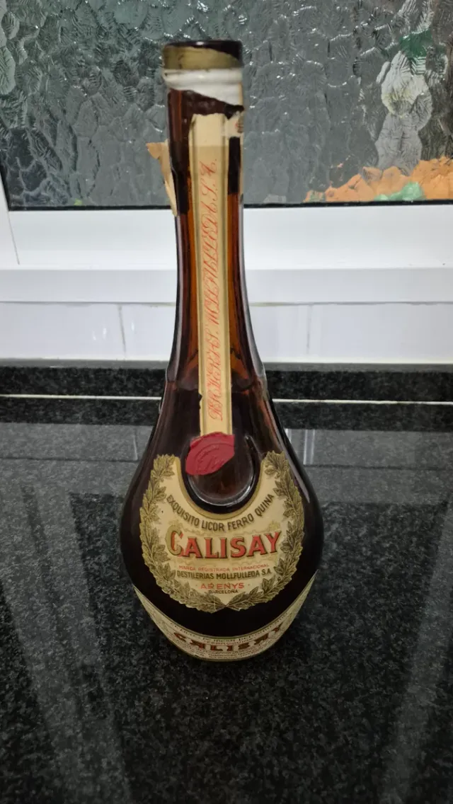 Botella antigua de licor Calisay, con etiqueta de 1966. Vacia - Exquisito licor Ferro Quina. - Marca registrada internacional. - Destilerías Molldefullieda S.A. Arenys, Barcelona.